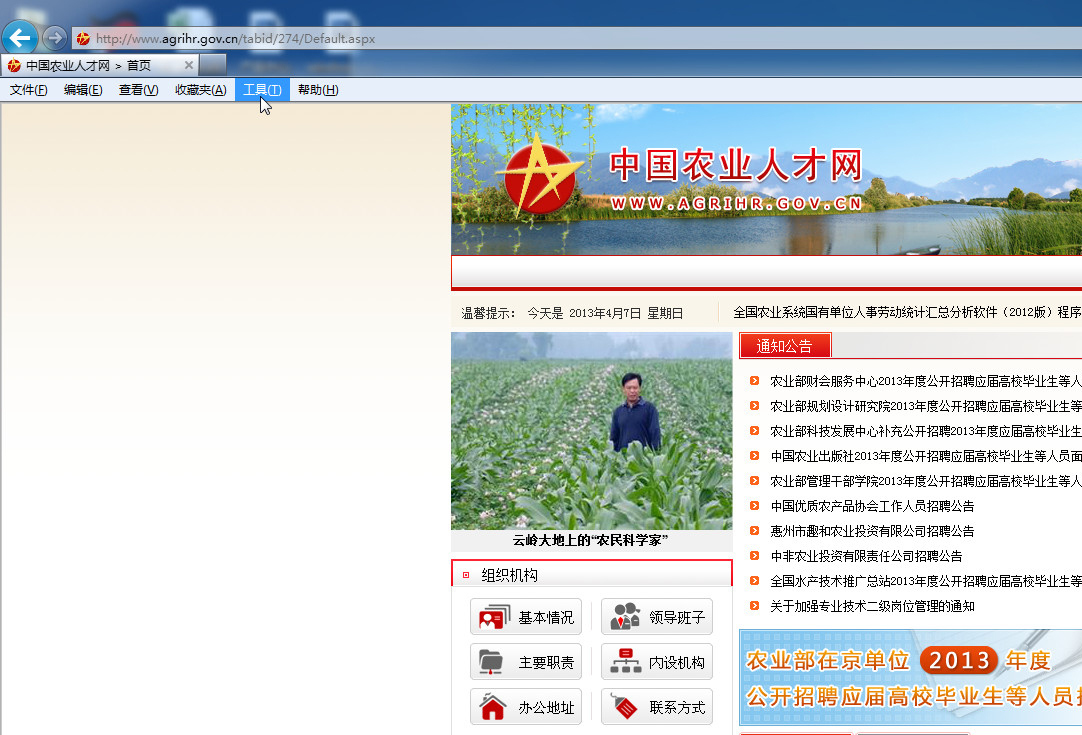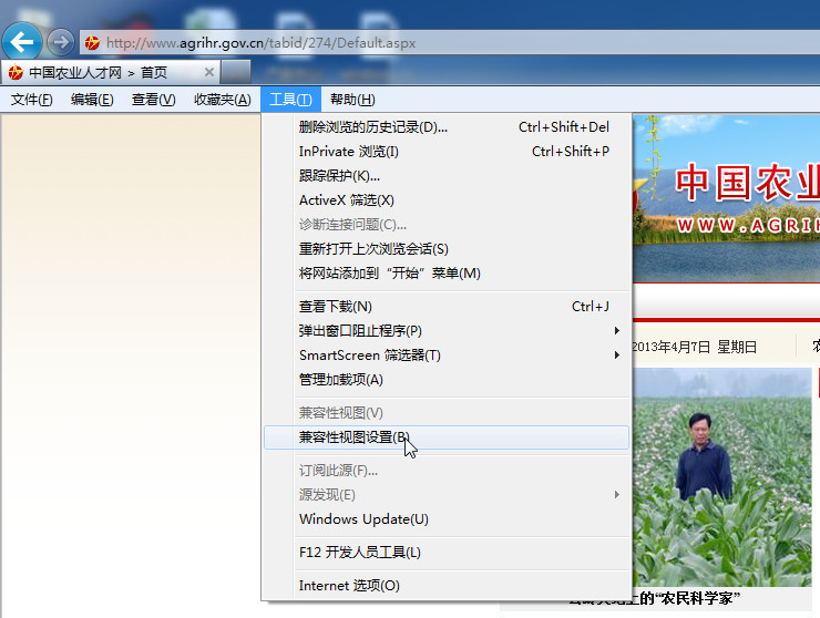 打开“ora28365(http://agrihr.gov.cn)”时,建议使用IE浏览器,如首页出现导航栏不显示或栏目错位现象时,需调整IE浏览器设置,具体操作步骤如下: