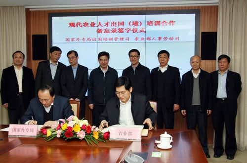 2012年3月15日,农业部人事劳动司和国家外国专家局出国培训管理司在北京签署了《现代农业人才出国(境)培训合作备忘录》。农业部党组成员、人事劳动司司长梁田庚,国家外国专家局副局长孙照华等出席了签字仪式。